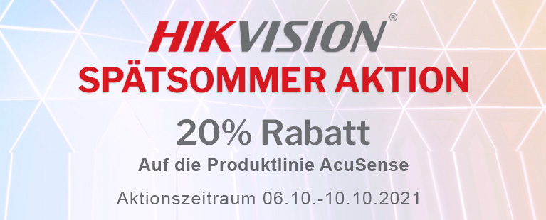 Die Hikvision Spätsommer Aktion 2021. Ausgewählte Produkte der Serie AcuSense erhalten Sie jetzt vom 06.10.2021 bis zum 10.10.2021 mit 20% Rabatt. Die Aktion gilt nur für nicht eingeloggt Kunden.