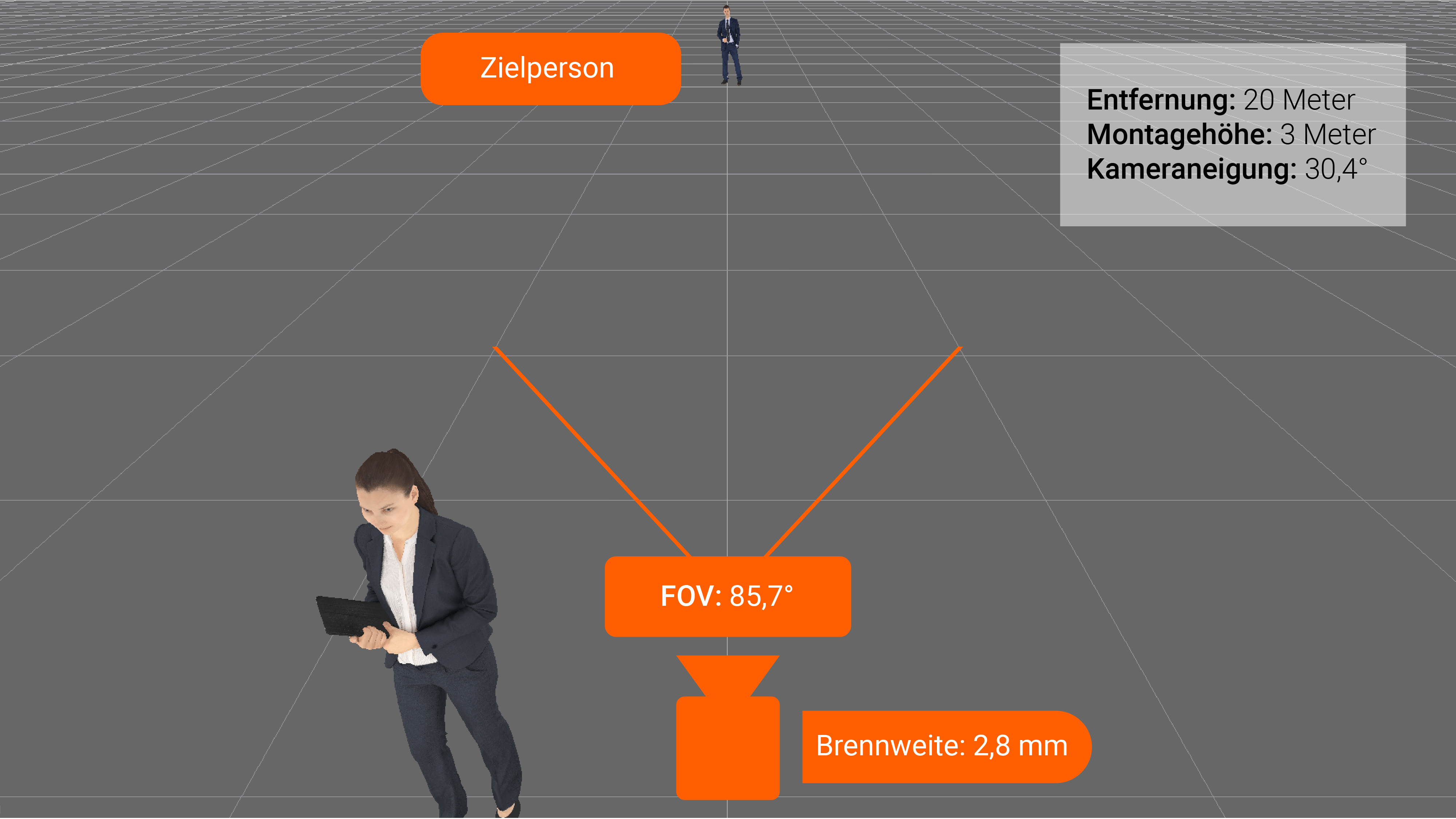 Höhe der Kamera 3 Meter/ Neigungswinkel der Kamera 21,7°/ Fixbrennweite 4mm/ Abstand des Ziels 20 Meter